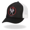 Hot Leathers Trucker Hats Are Made Of 5 Panel Quality Construction Featuring an Original Hot Leathers Patch on The Front. Each One Is Adjustable with A Flat or Curved Bill and A Mesh Back with A Snap Closure. This Hat Has A Black Front Panel and Bill and White Mesh And Snap Closure In Back. The Front Panel Features An Embroidered Rooster Surrounded By A Red Circle.