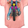 This baby bodysuit comes in the color pink and features a screen printed image of a "headless" biker girl starting at neckline.