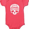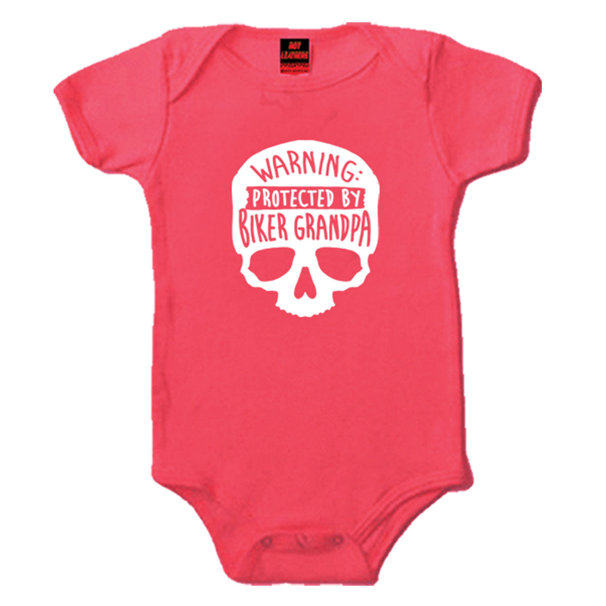 This adorable baby bodysuit comes in the color pink and features a screen printed image of skull with the text "WARNING: PROTECTED BY BIKER GRANDPA" within the skull.